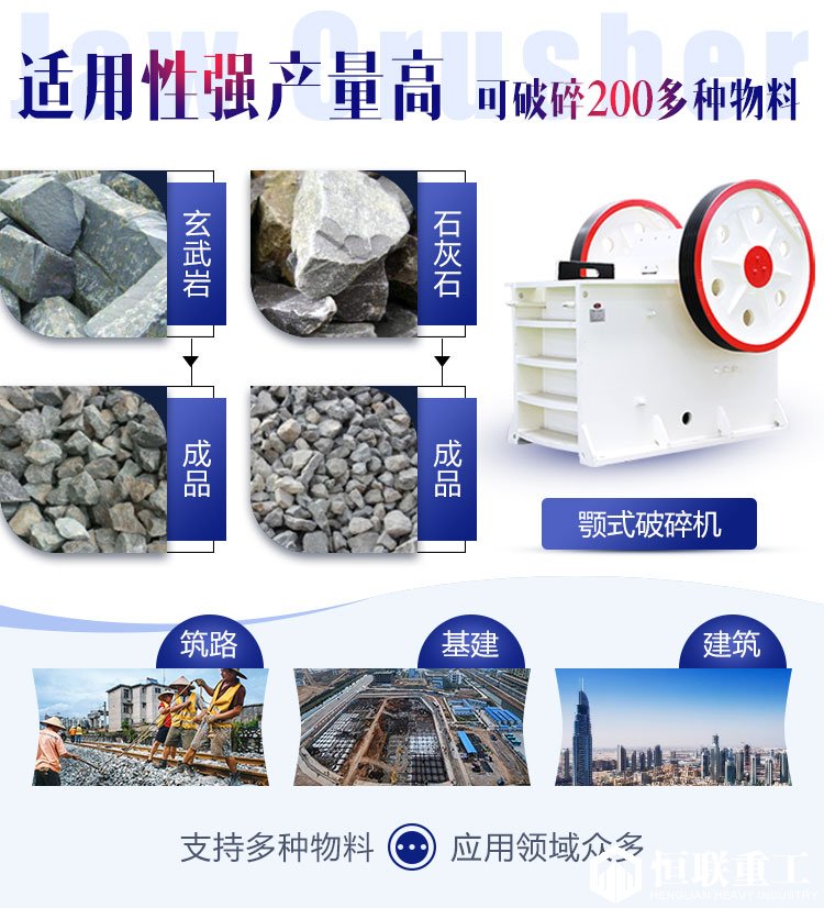 鄂式破碎机被广泛用于抗压强度320兆帕以下的各种物料的粗碎、中碎作业。该破碎机已广泛运用于矿山、冶金、化工、建材、公路、铁路、水利等行业。