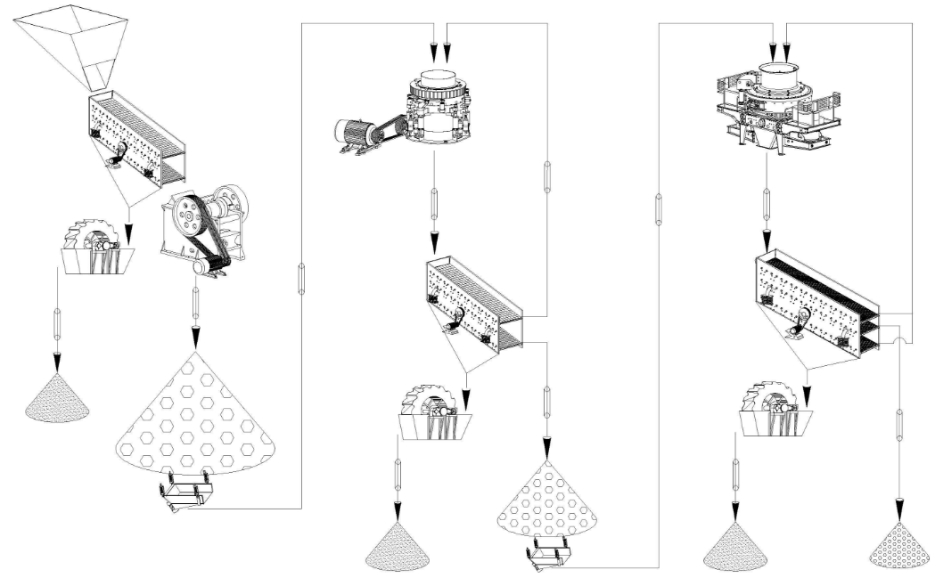 首先开采的鹅卵石通过振动筛进行筛分,将细小的符合要求的通过洗砂机直接制成成品料、不满足粒度要求的先通过颚式破碎机进行一级破碎,然后通过皮带机送入到圆锥破中进行二级破碎,破碎后的物料再次通过振动筛进行筛分,符合要求的通过洗砂机进行洗砂,不符合的物料通过皮带机送入到鹅卵石九游老哥J9俱乐部官网中进行制砂、整形。再由振动筛进行筛分,降符合要求粒度大小的物料进行洗砂,不符合要求的物料再次通过鹅卵石九游老哥J9俱乐部官网进行循环破碎,终得到成品物料。